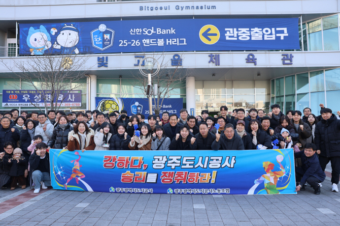 光州都市公社は24日、光剛体育館で開かれた新韓SOL Bank 2025-2026ハンドボールHリーグ女子部1ラウンドホーム競技で労使共同で一心応援行事を行った。