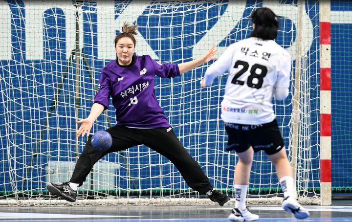 25日、仁川市役所と競技で相手のシューティングを阻止する三陵市役所パク・セヨンゴールキーパー。 (出典=連合ニュース)
