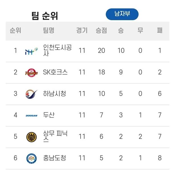 河南市役所と斗山が中位圏を形成して順位競争を続けており、今後の試合結果によって順位変動の可能性も高まっている。首位独占と中尉権の混戦が同時に繰り広げられ、男子版図はさらに興味深い流れで展開されている。