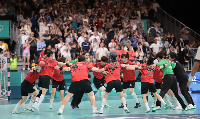 25日午後(韓国時間)フランス パリサウス パリアリーナ6で開かれたパリオリンピックハンドボール女子予選ラウンドA組 大韓民国とドイツの試合で勝利した大韓民国選手たちがコートにあふれ出て喜びを交わしている。