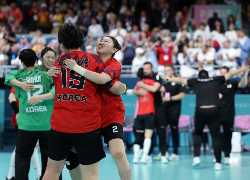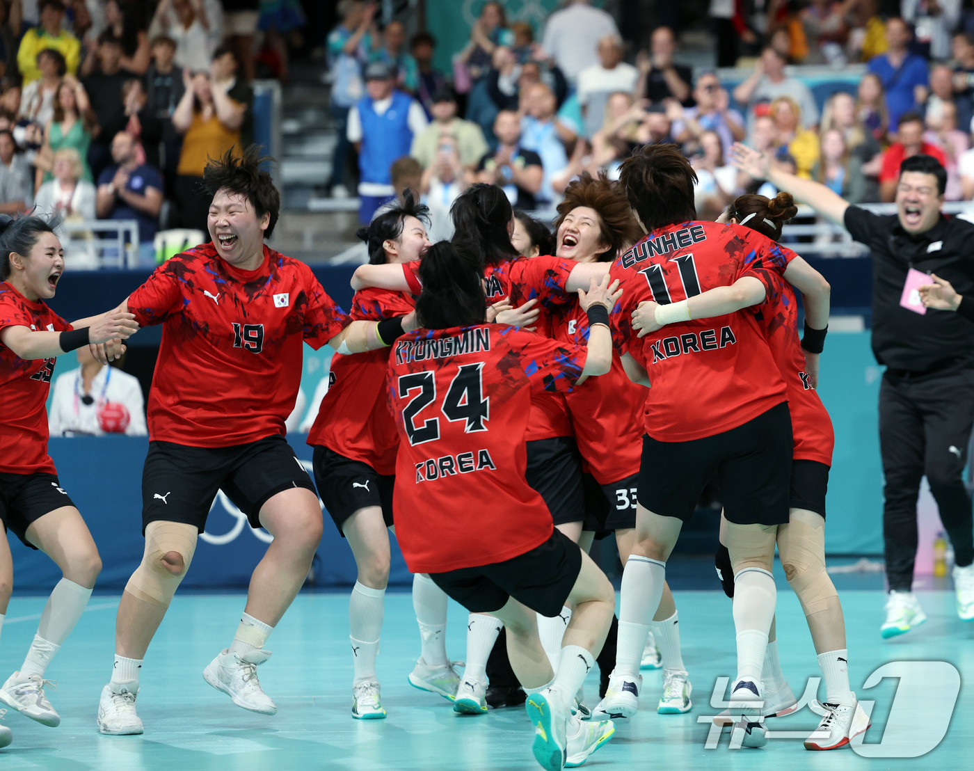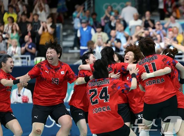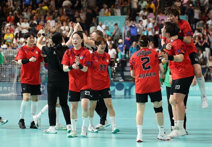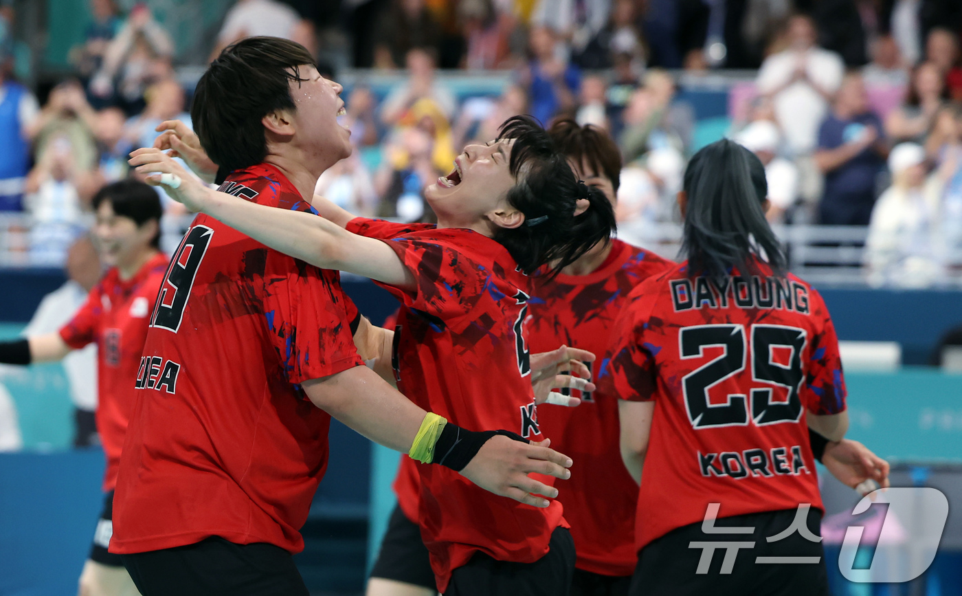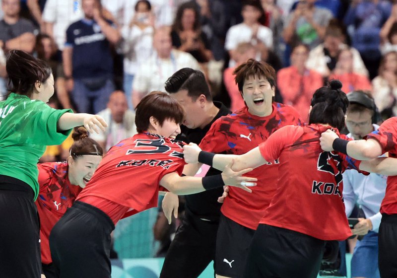 25日午後(韓国時間)フランス パリサウス パリアリーナ6で開かれたパリオリンピックハンドボール女子予選ラウンドA組 大韓民国とドイツの試合で勝利した大韓民国選手たちが喜びを分けている。 2024.7.26/ニュース1