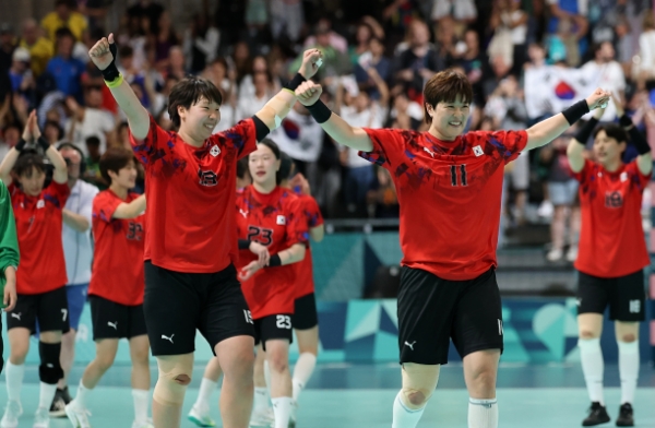 韓国の優しさが26日終わった女子ハンドボールグループリーグA組1次戦ドイツと試合で勝利を収めた後歓呼している。 2024.7.26 psoq1337@newspim.com