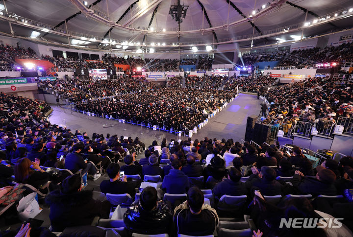 16日午後、ソウル松坡区オリンピック公園ハンドボール競技場で開かれた2024体育人大会で、参加者がイ・ギフン大韓体育会長の開会会社を聞いている。 2024.01.16.hwang@newsis.com