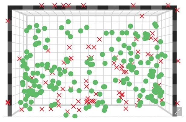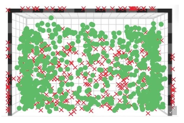 シューターがこのコースを好むにはそれほどの理由がある。ビプロのVisualization Dataを通じて、シューティング方向の位置と得点成功を見ると、この4つのゾーンに多くのゴールが入ったことを確認することができる。上側はゴールキーパーの手にかかる確率もあるが、どうやらゴールを抜け出せて忌避したようだ。下側はバウンドを活用したシュートも可能なため、上側よりも下側を好むように見える。