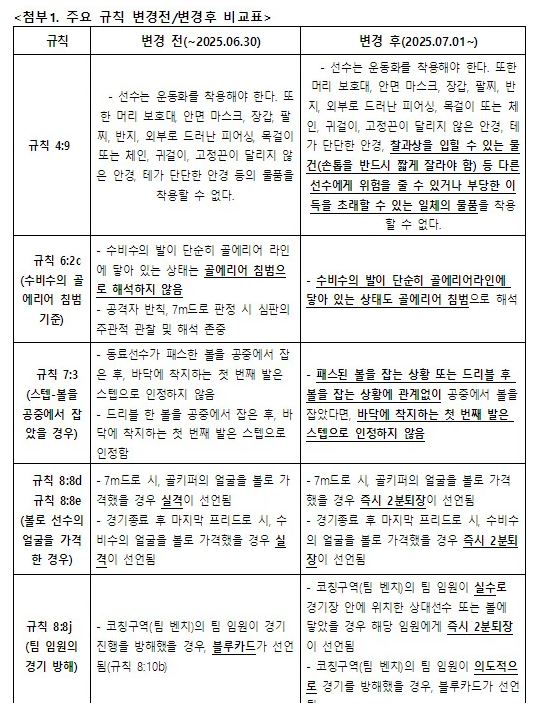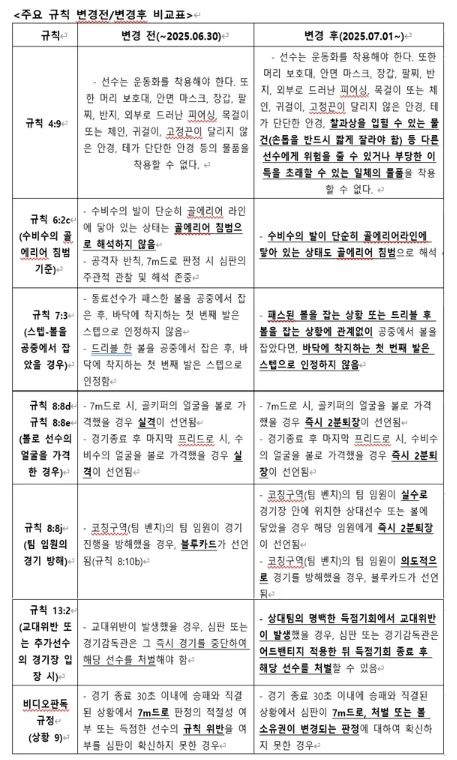 韓国ハンドボール連盟、審判本部イ・ソク次長は「今回の改正の核心は競技規則と審判判定の客観性確保」とし「不確実性を最小化し、不要な介入を減らし、速いテンポのハンドボールを具現しようとする」と説明した。