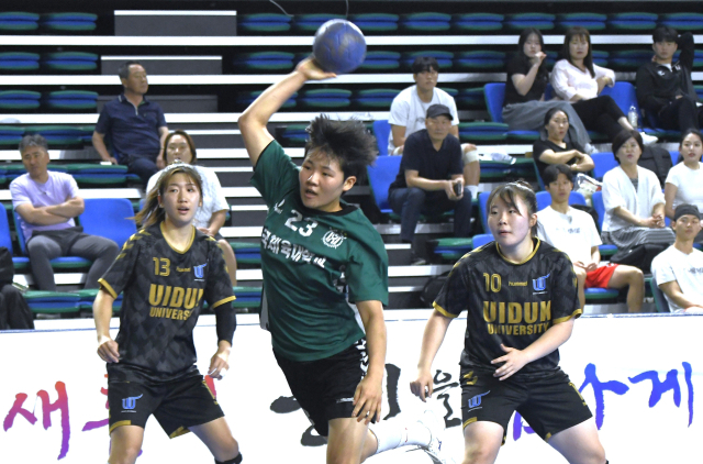 韓国体隊チョ・ユヒ(真ん中)が9日、2025年全国大学ハンドボール統合選手権大会女子大統領第1部ウィドク大戦でシューティングを試みている。大韓ハンドボール協会提供