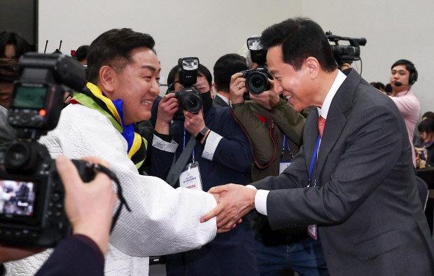 キム・グァンヨン全羅北道道知事が28日、ソウル松坡区オリンピックパークテルで開かれた大韓体育会代議員総会で2036年夏季オリンピック大会誘致候補都市に全羅北道が選定された後、競争を繰り広げたオ・セフンソウル市場と挨拶している。全北は28日、ソウル松坡区オリンピックパークテルで開かれた大韓体育会2025年度定期代議員総会で行われた2036オリンピック誘致国内候補地選定投票で計61票のうち49票を得てソウル(11票)を破った。無効票が1票であった。