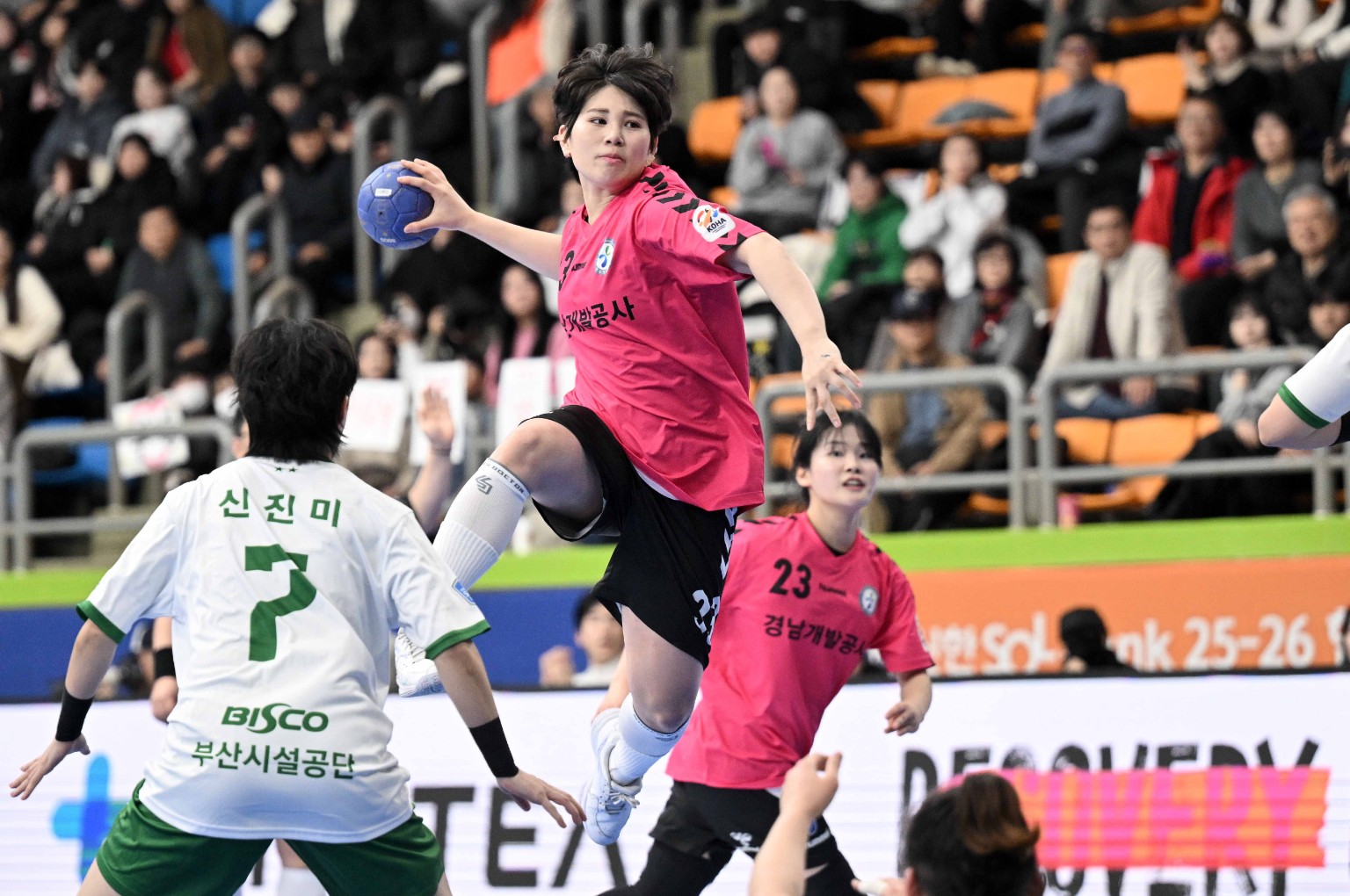しかし釜山施設公団はヨン・ウニョンの連続得点に続き、権限ナの7mスローで23-24、1ゴール車で追撃し、終了3分余りを残してはバンミンソがリュ・ウンヒのアシストを受けて速攻得点を上げて26-26、同点を作った。