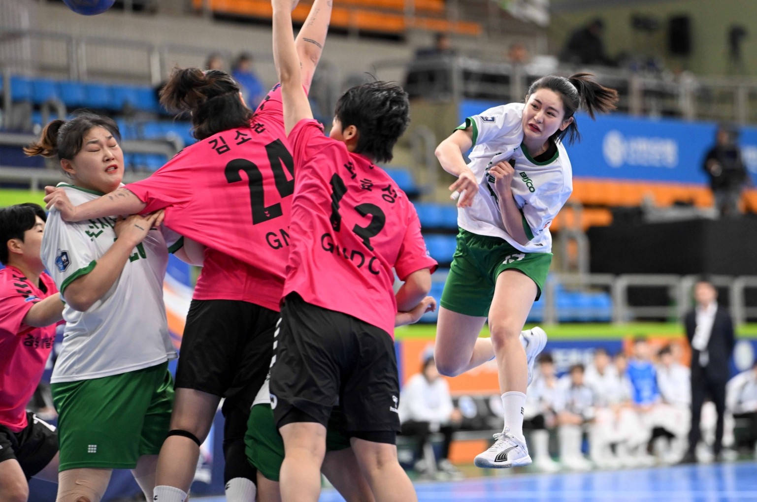 権限私のゴールが相次いで出てきて釜山施設公団が1ゴール車で着実に追いついたが、失策が出て再び格差が広がった。慶南開発公社がチョン・イェヨンの連続ゴールで16-13、3ゴール車まで逃げて危機から抜け出した。結局慶南開発公社が16-14に先んじて前半を終えた。
