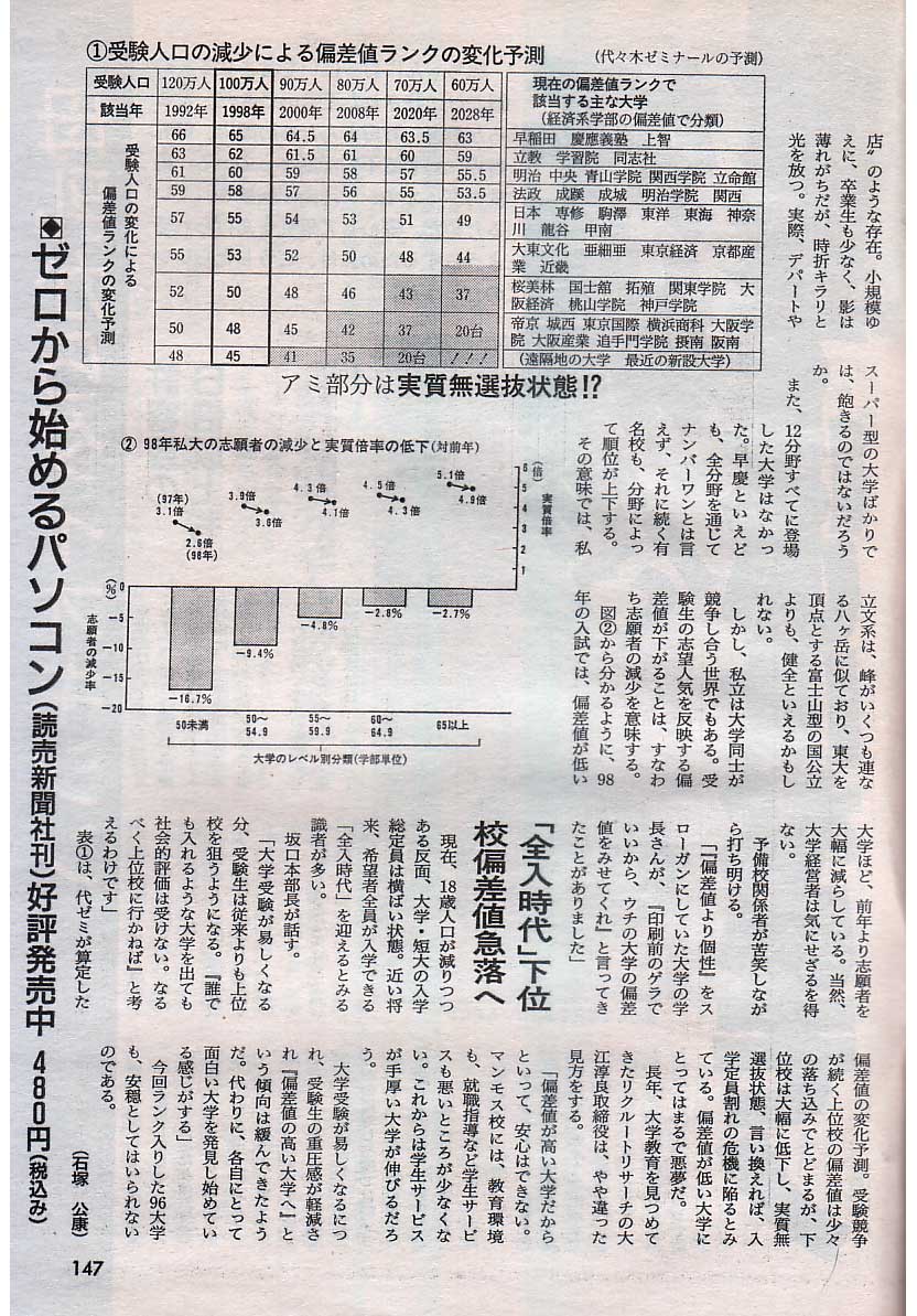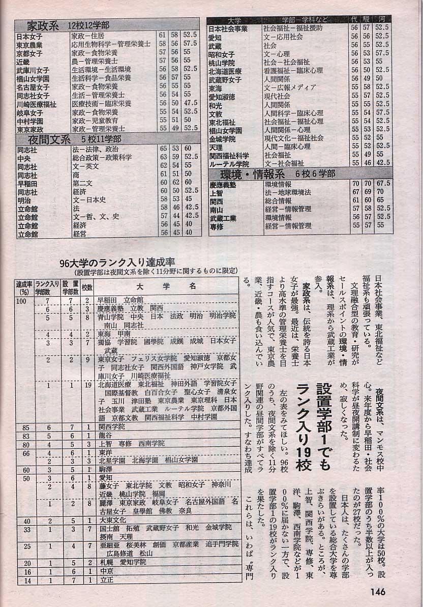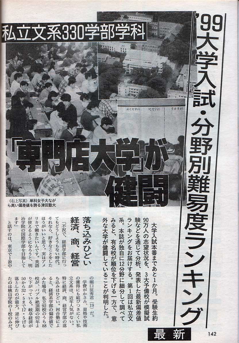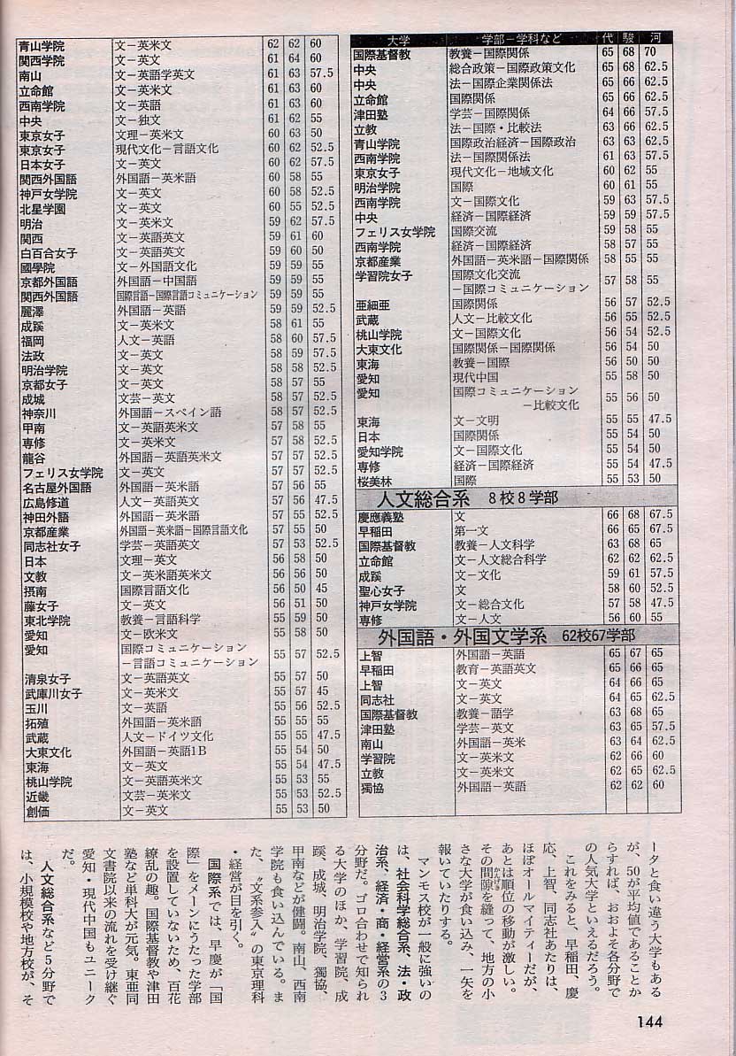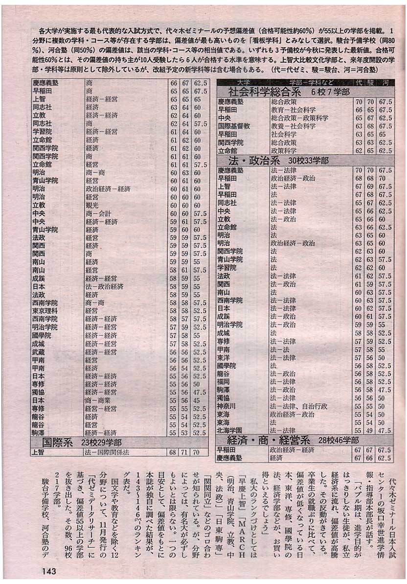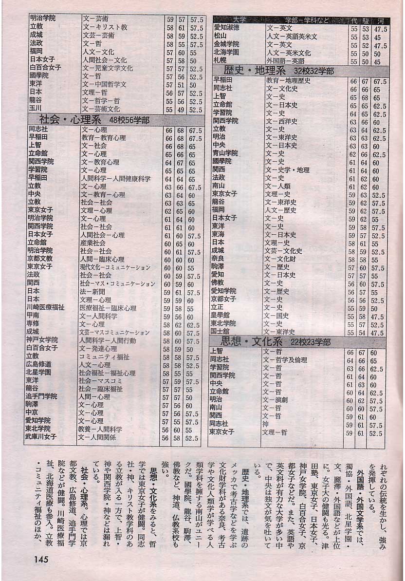 1999年度・私大偏差値(駿台、代ゼミ、河合塾)