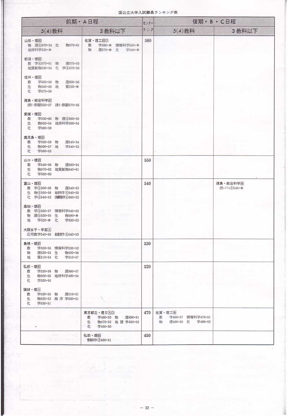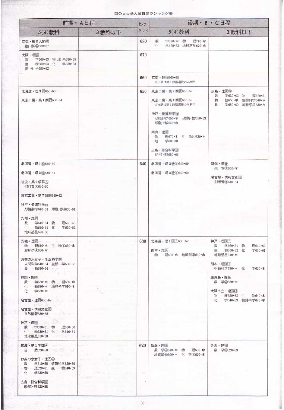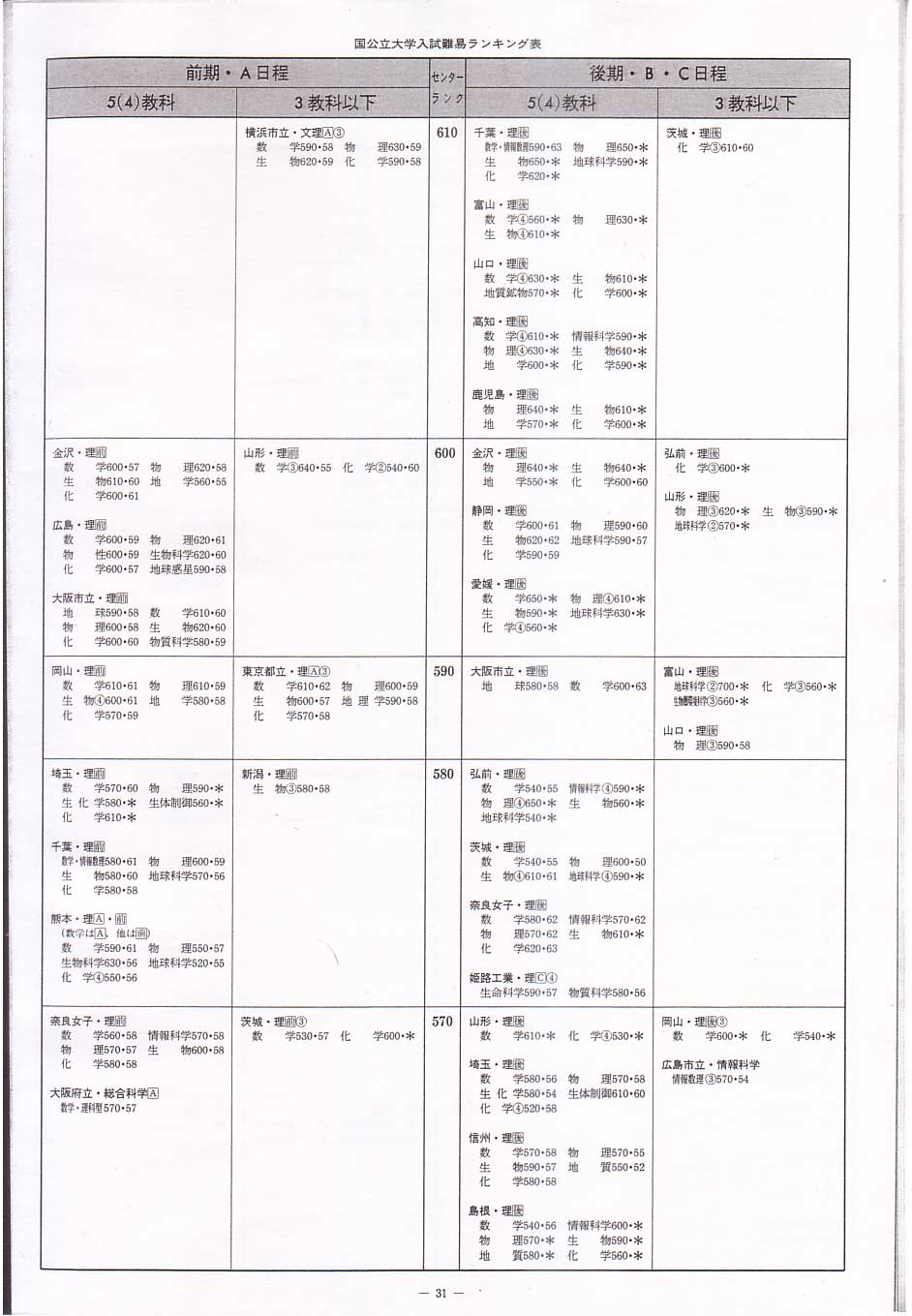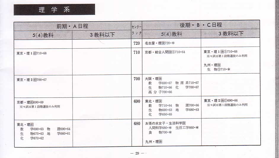 代々木ゼミナール入試難易ランキング 1995年度 国公立 理学系